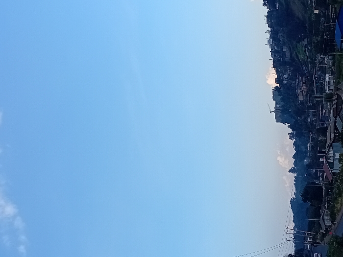 An upward-angled outdoor shot exhibits a vast, clear blue sky occupying the left side of the frame. The right side features a hillside densely populated with houses and buildings. A construction crane is visible among the structures. Power lines run along the base of the hill near a road with a single vehicle. The overall scene suggests a settlement built on a steep slope under a cloudless sky.
