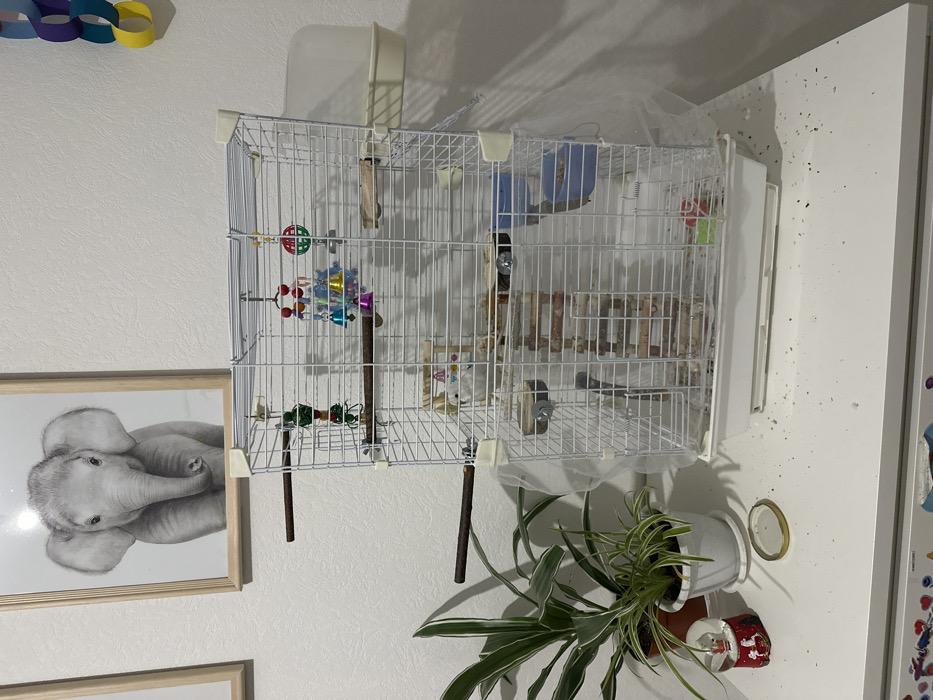 The image depicts an indoor scene within a residence in Murino, Russia. A multi-level white wire birdcage, approximately 0.75 meters tall, stands centrally on a white, flat surface. Inside the cage, two small white birds, consistent with budgerigars, are visible on perches; one is in the upper section, and another is lower near a vertical wooden ladder. The cage contains several natural wood perches, a wooden ladder, multiple suspended bird toys (including one with green, yellow, and red elements, another with colorful beads and bells, and a spherical green and red toy), and blue and white plastic food/water dishes. A transparent plastic water dispenser is attached to the exterior right side of the cage, and a fine white mesh fabric partially surrounds the lower exterior. The white surface beneath the cage is scattered with birdseed husks, small feather fragments, and other debris. To the left of the cage, a potted plant with variegated green and white leaves is in a white pot, with a taller green plant in a brown pot behind it. A snow globe with a red base and a festive figure is also on the surface, along with a golden circular metal lid. On the white wall above the cage, a framed black-and-white print of a baby elephant is centrally displayed, with a partial view of another framed item to its left. A vertical string of colorful paper chain decorations is visible on the wall to the far right.