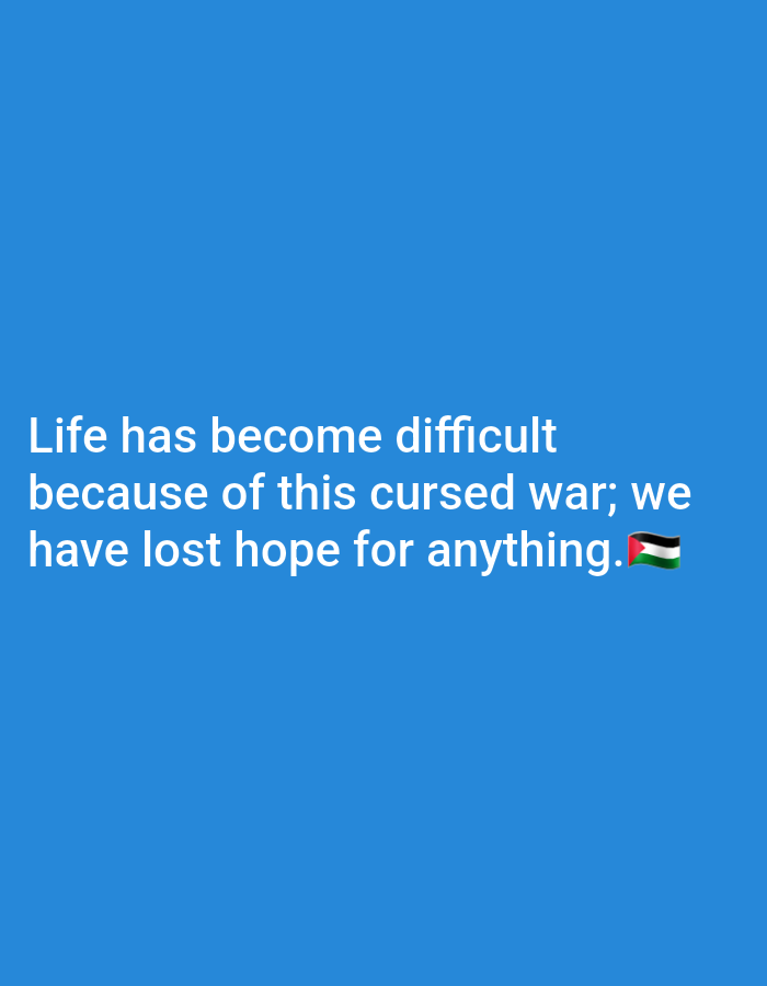 The image is a simple text post on a blue background. The text expresses a sense of hopelessness and despair due to a "cursed war." The text reads, "Life has become difficult because of this cursed war; we have lost hope for anything." The Palestinian flag emoji is placed at the end of the sentence, implying the war affects Palestinians. The overall tone is somber and highlights the emotional toll of conflict.
