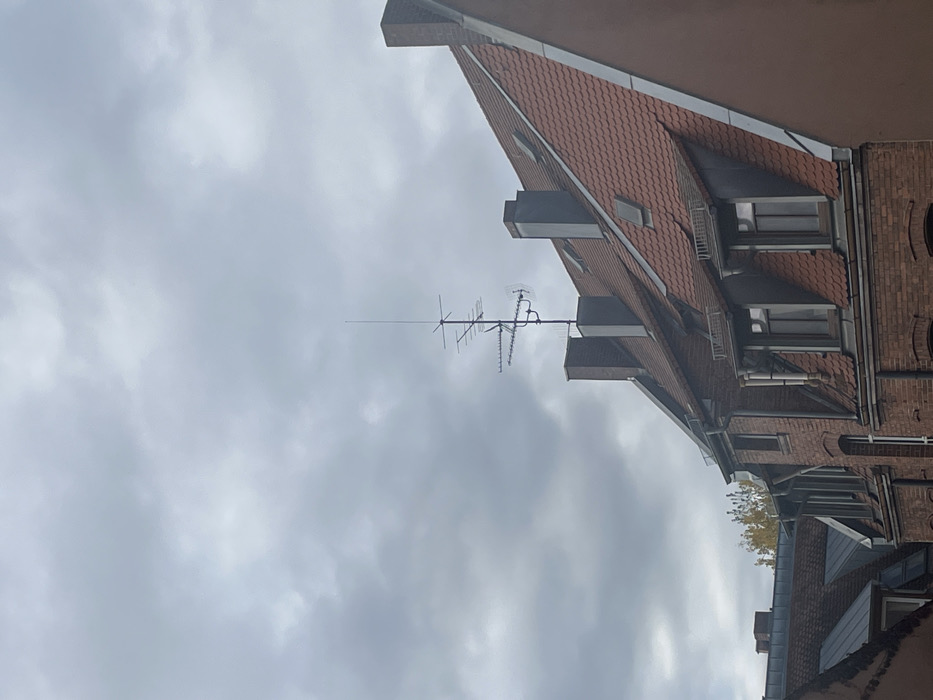 The image depicts the rooftops of residential or mixed-use buildings in Fürth, Germany, viewed against an overcast sky. The upper two-thirds of the frame are dominated by a uniformly light grey, cloudy sky with diffuse cloud formations. In the foreground, a prominent building features a steep, red terracotta tiled mansard roof with overlapping tiles. Two rectangular dormer windows are visible on this roof section, each equipped with dark-framed windows and a dark, possibly metal, fascia or overhang. A tall, rectangular brick chimney with a dark cap rises from the right side of this roof. The building's visible facade below the roofline is constructed of red brick. Centrally positioned on the foreground building's roof, situated between two dark-capped chimneys, is a complex, multi-element antenna array. This array consists of a tall, slender vertical whip antenna at its apex, mounted on a central metal mast. Below the whip, several horizontal Yagi-style antennas with multiple parallel elements are affixed to the mast at various heights. A smaller, possibly circular or omnidirectional, antenna element is also visible lower on the mast. The entire antenna assembly appears dark metallic. To the left and slightly behind the foreground structure, other buildings with similar red tiled roofs, dark dormer windows, and red brick facades are partially visible. A single chimney is seen on one of these background rooflines. In the far left background, a cluster of trees displaying yellow autumn foliage is present. No people, animals, or dynamic actions are depicted within the scene.