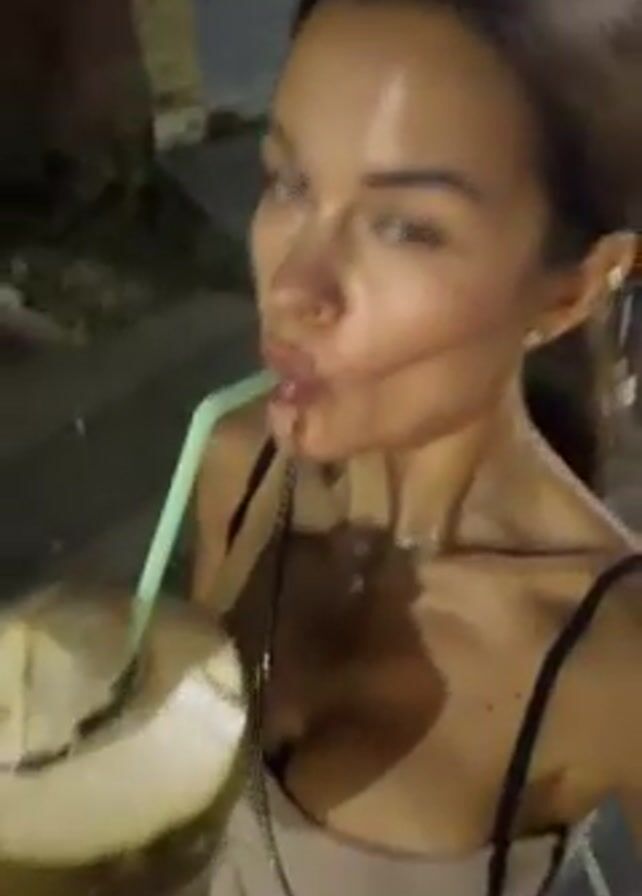 A woman with dark hair and light skin is taking a selfie video while drinking from a coconut with a green straw