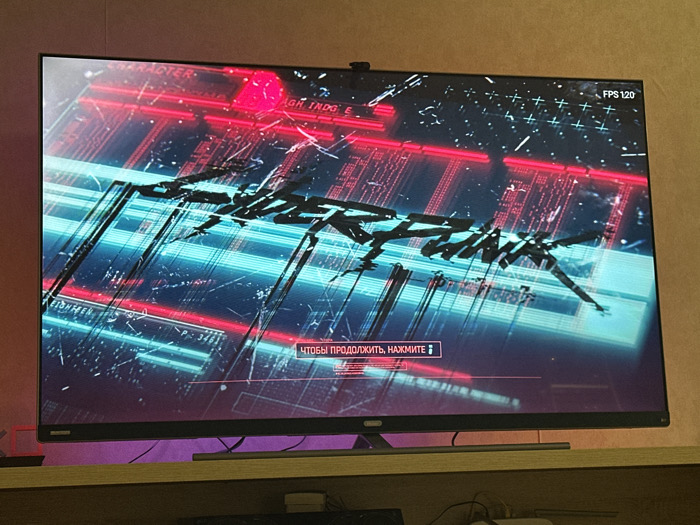 The image depicts an indoor scene in Нестюково, Russia, focused on a large, flat-screen television displaying the title screen of the video game "Cyberpunk 2077." The television exhibits thin black bezels and has a small, black object, possibly a camera or sensor, mounted centrally on its top edge. The screen features the game's stylized "CYBERPUNK 2077" logo predominantly against a dark, glitch-effect background with prominent red and cyan neon lines. In the upper right corner of the screen, "FPS 120" is visible, indicating a refresh rate. At the bottom, a rectangular prompt in white text with a red border reads "ЧТОБЫ ПРОДОЛЖИТЬ, НАЖМИТЕ" (TO CONTINUE, PRESS). The television rests on a light-colored, horizontal wooden or laminate surface. Below the television, a purple ambient light glows, suggesting backlighting. The wall behind the setup is a plain, light, warm-toned surface. To the left on the console, a small red object is partially visible, and to the right, cables and an indistinct electronic device are present. No individuals are visible.