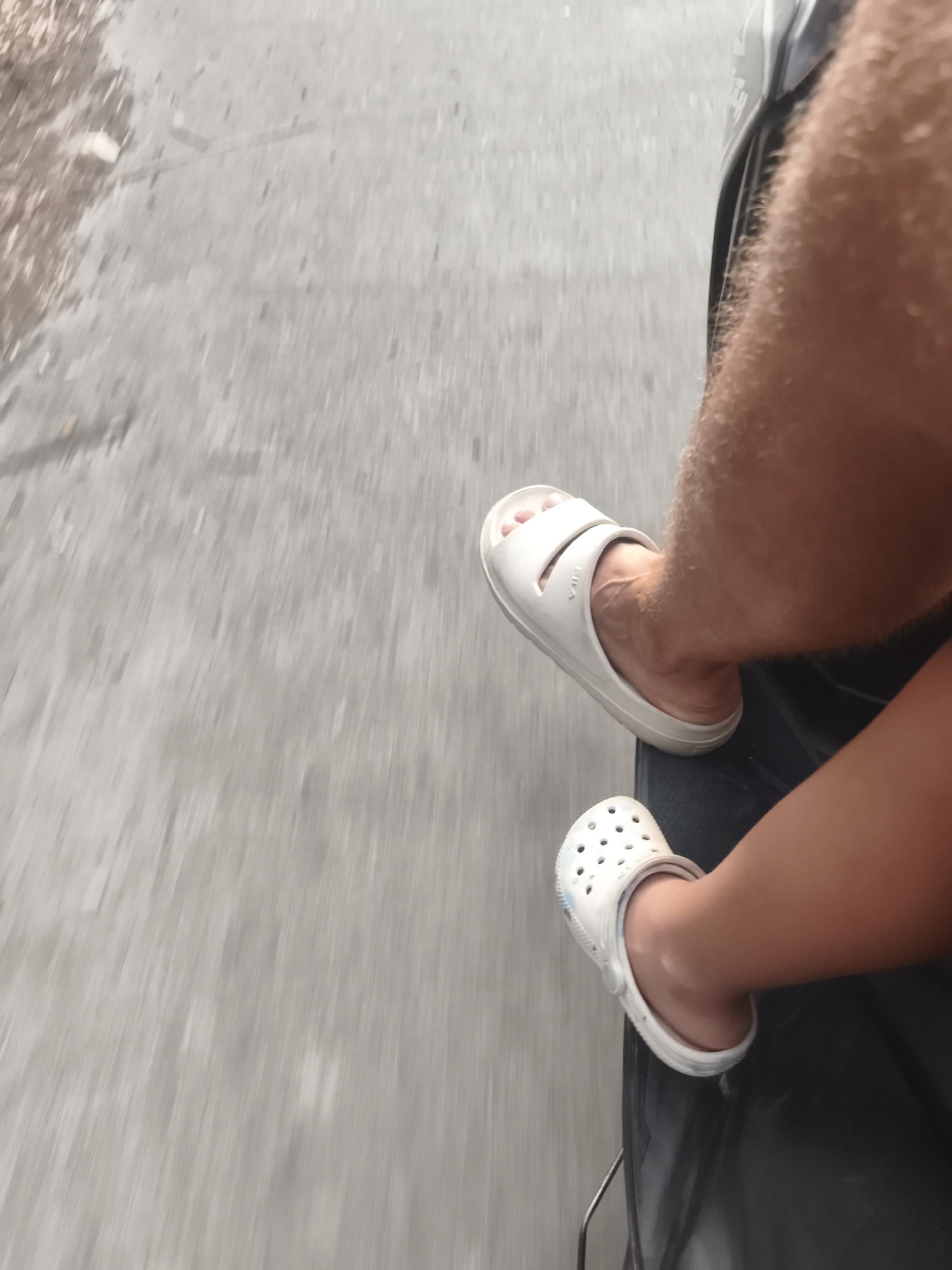 two pairs of legs dangling from a moving vehicle, likely a car, in what appears to be an urban environment. The background is blurred, indicating motion. The upper leg is larger and more hairy, wearing a white slide sandal. The lower leg is smaller, suggesting a child, and is wearing white Crocs. The photograph is taken at an angle looking down and out from the vehicle, possibly in the city of บ้านบางรักษ์, Thailand. The details about the city are inferred since the picture is not detailed enough to confirm the exact place.