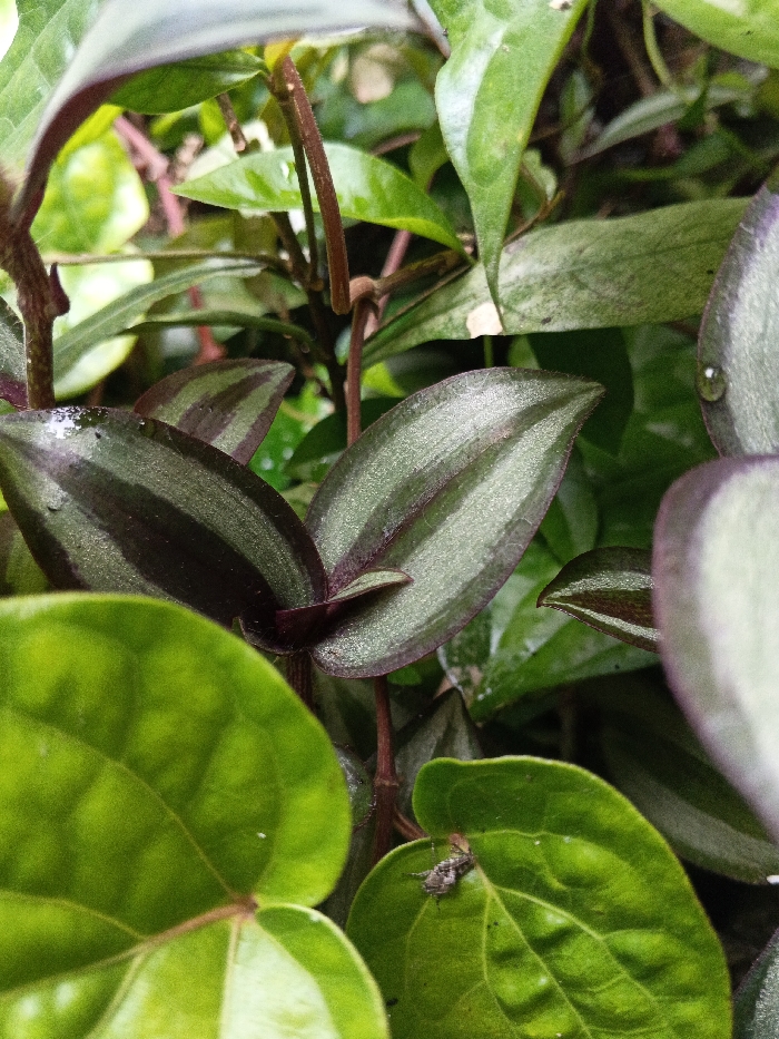 A close-up captures a variety of lush green and purple-striped leaves. Some appear wet, adorned with water droplets. A small insect rests on a vibrant green leaf in the foreground. The scene is brightly lit and focused, highlighting the textures and vibrant colors of the plant life. The leaves overlap and intertwine, creating a dense, vibrant composition.