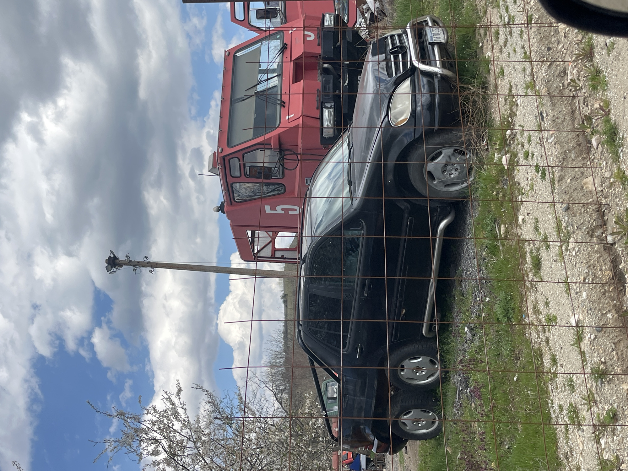 black Mercedes-Benz ML-Class SUV parked in front of a red and white fire truck. Both vehicles are located behind a chain-link fence. The background includes a utility pole, a flowering tree, and a cloudy sky. The scene appears to be a junkyard or vehicle storage area. The license plate on the SUV reads "B 6783 BB." There is no indication of people in the image. The vehicles are surrounded by gravel and weeds. The location is assumed to be Resilovo, Bulgaria.