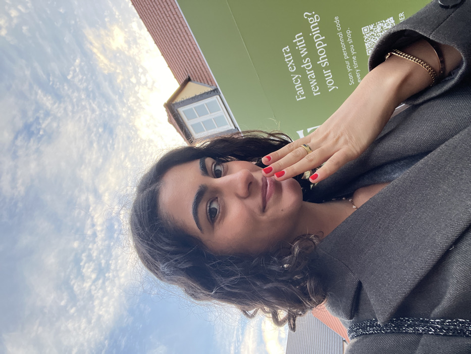 A young adult female is depicted in a close-up portrait taken outdoors in Serris, France. She has dark, curly, shoulder-length hair and wears a dark grey double-breasted coat over a lighter grey garment, with a beaded necklace visible. A dark-chained bag strap is present on her left shoulder. Her right hand is raised, fingers splayed, covering part of her chin and mouth. Her fingernails are painted red, and she wears a gold-colored band ring on her right ring finger, along with gold-colored chain and bangle bracelets on her right wrist. She is looking directly at the camera with a slight smile. The background features a sky with scattered cirrocumulus clouds. To the right of the subject, a large light green sign displays the English text "Fancy extra rewards with your shopping?" with a QR code below it. Behind the subject and sign, a building with a reddish-brown tiled roof and a white-framed dormer window is visible.