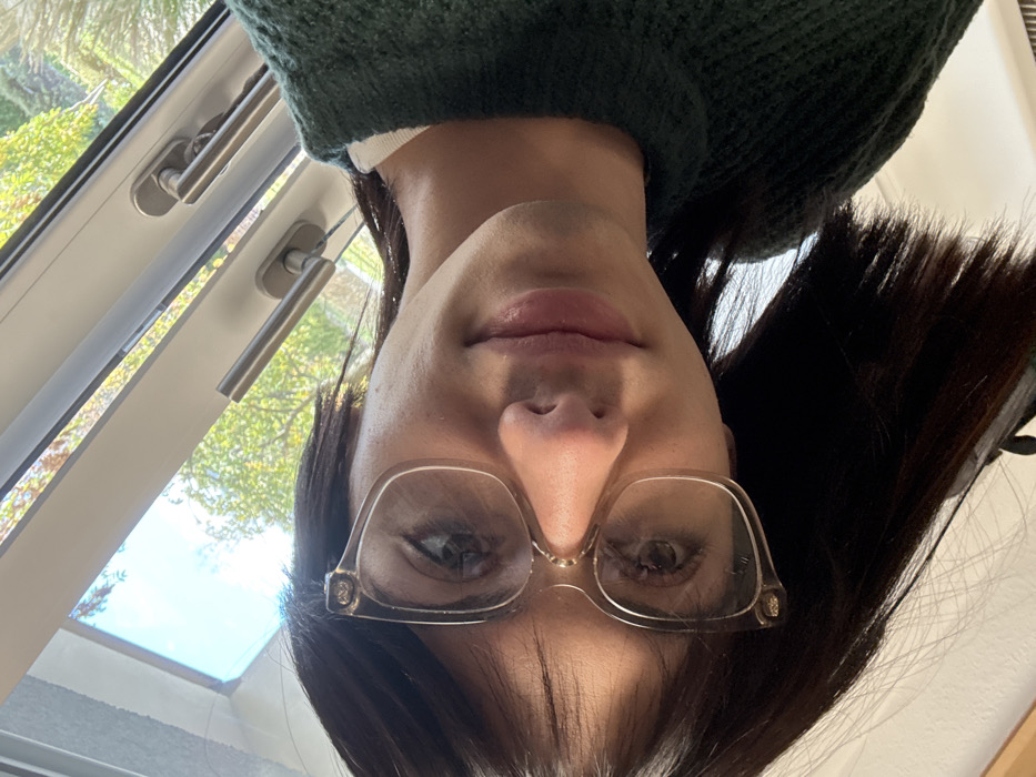 The image captures a close-up, tilted portrait of an individual inside a room in Dresden, Germany. The subject, appearing female, has dark hair with bangs and wears clear-framed eyeglasses featuring small gold accents on the temples. They are dressed in a dark green knitted sweater over a white collar garment. The individual's face is illuminated by natural light, casting some highlights and shadows, and their lips are slightly upturned. The gaze is directed towards the camera. Behind the individual, a white-framed window is visible, appearing to be partially open, showcasing two silver-colored window handles. Through the window, vibrant green foliage of trees and a bright blue sky are discernible, indicating daylight conditions. The overall scene is captured from a low, upward angle, resulting in a significant counter-clockwise tilt of the entire frame.