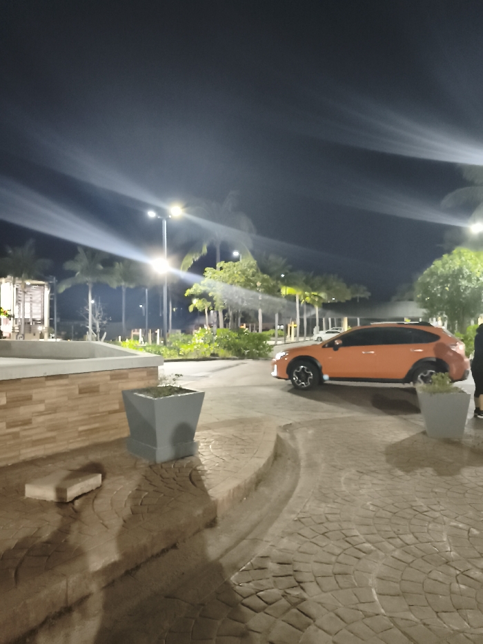 An outdoor scene at night features an orange Subaru parked near the right side. To the left, there is a low brick structure and gray planters with greenery. Streetlights illuminate palm trees and other vegetation in the background. The ground is paved with a pattern resembling cobblestone. The sky is dark with streaks of light, likely from the streetlights, creating a hazy effect.