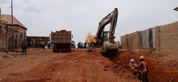 This image depicts an active construction and excavation site on a dirt road in Rigasa, Nigeria, under an overcast sky