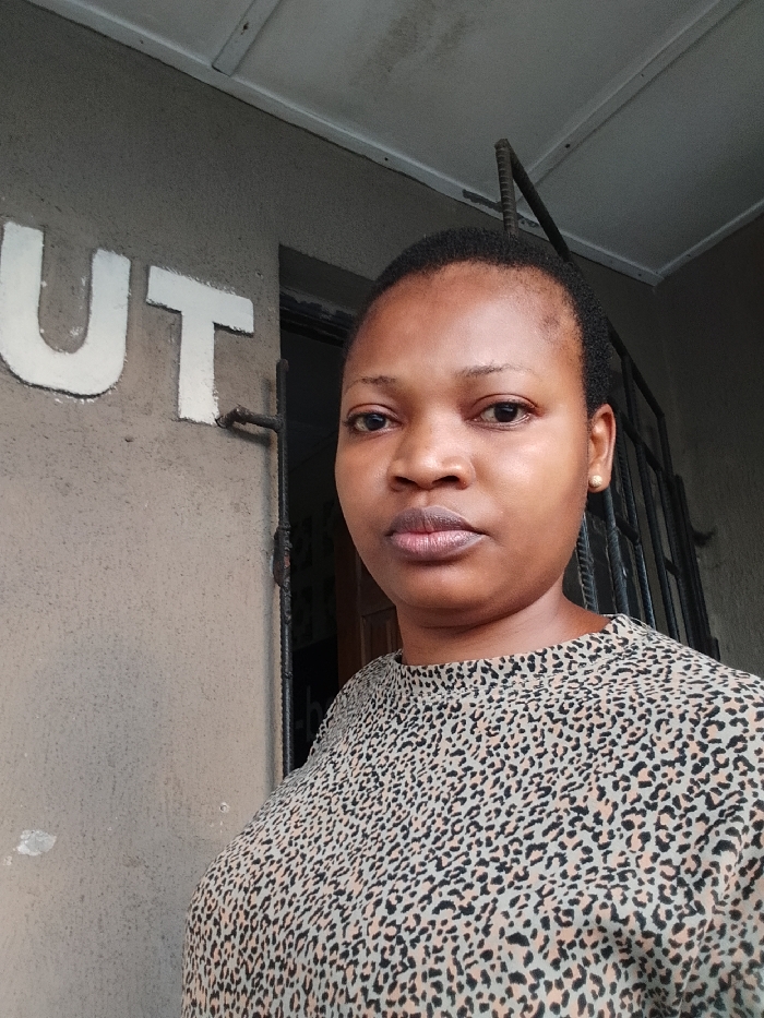 A medium close-up photograph captures an adult female, facing forward with a neutral expression and direct gaze towards the camera. She possesses a dark complexion, short dark hair, and wears a light-colored top patterned with dark leopard spots. A small, round, gold-toned earring is visible in her right ear. To her left, the background consists of a light grey-brown textured wall featuring two prominent, raised white capital letters, "UT". To her right and slightly behind her, a dark recessed area, consistent with a doorway or window, is partially visible, obscured by dark metal bars. The upper frame reveals an off-white soffit or ceiling structure with visible paneling, from which a dark metal rod protrudes vertically on the right side. The scene depicts an exterior or semi-enclosed architectural space in the city of Agani, Nigeria.