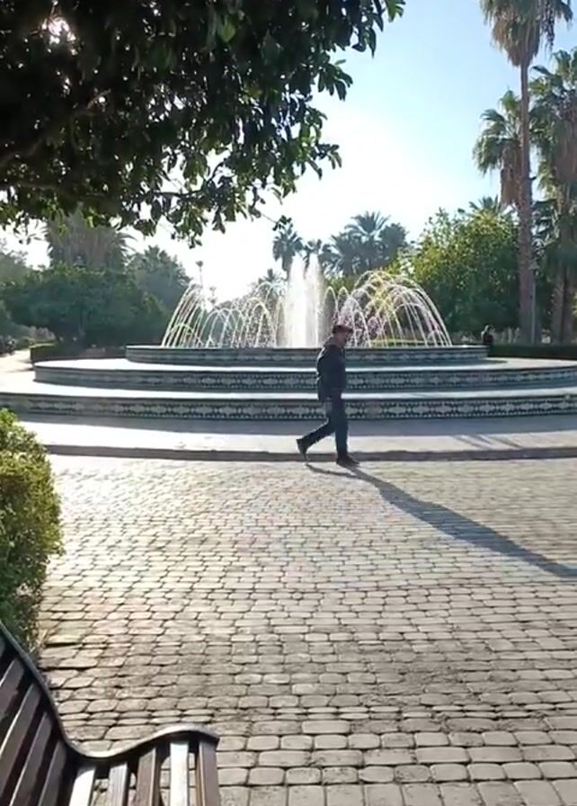park with a large, ornate fountain in the center, surrounded by a tiered base with tiled trim. The fountain's water jets create illuminated arches. The park is paved with cobblestones, and a wooden bench is visible in the foreground. A person wearing a jacket, pants, and hat walks across the paved area, casting a long shadow. Palm trees and other greenery are scattered throughout the park, with a clear blue sky overhead. The lighting suggests it is morning or late afternoon, with a low sun angle.