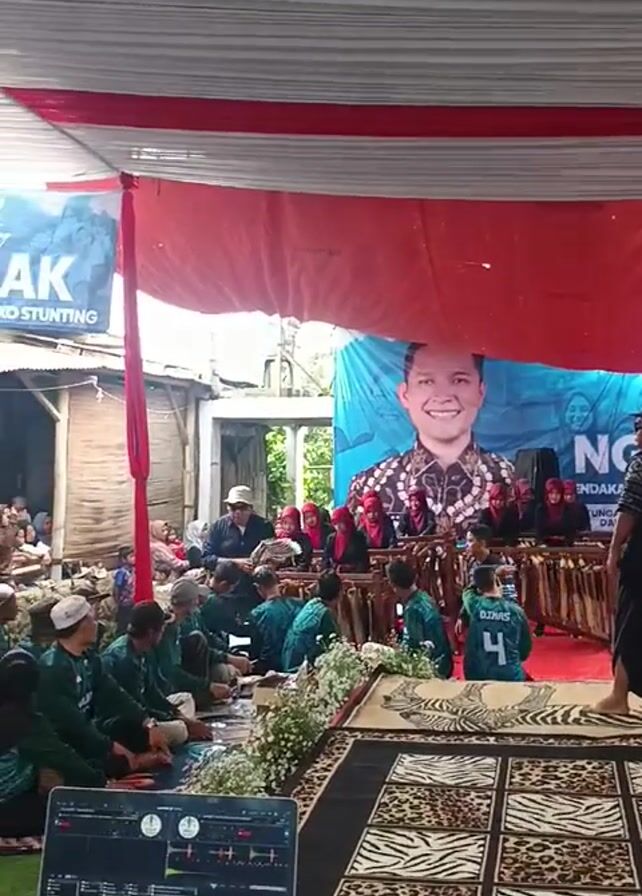 group of people gathered under a large tent, possibly for a community event. There are men and women, some sitting on the floor, others standing and walking around. Many are wearing green shirts, suggesting a uniform or coordinated outfit. A laptop with DJ software is visible in the foreground, indicating music or audio is being played. Banners are hung behind the crowd, featuring images of people and text, one visible banner reads "NGAPRAK" and "Mendak Keluarga Berisiko Stunting". The setting appears to be semi-outdoors with buildings visible behind the tent.