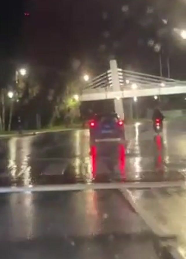 The video depicts a street scene at night during a heavy rain. The recording is taken from the inside of a vehicle with raindrops visible on the windshield. A blue car is stationary in the distance, its taillights reflecting vividly off the wet road surface. A motorcycle pulls up beside it. In the background, a white bridge-like structure is illuminated with lights. Streetlights line the road. A few pedestrians can be seen on the sidewalk. The sound of an engine can be heard in the background.