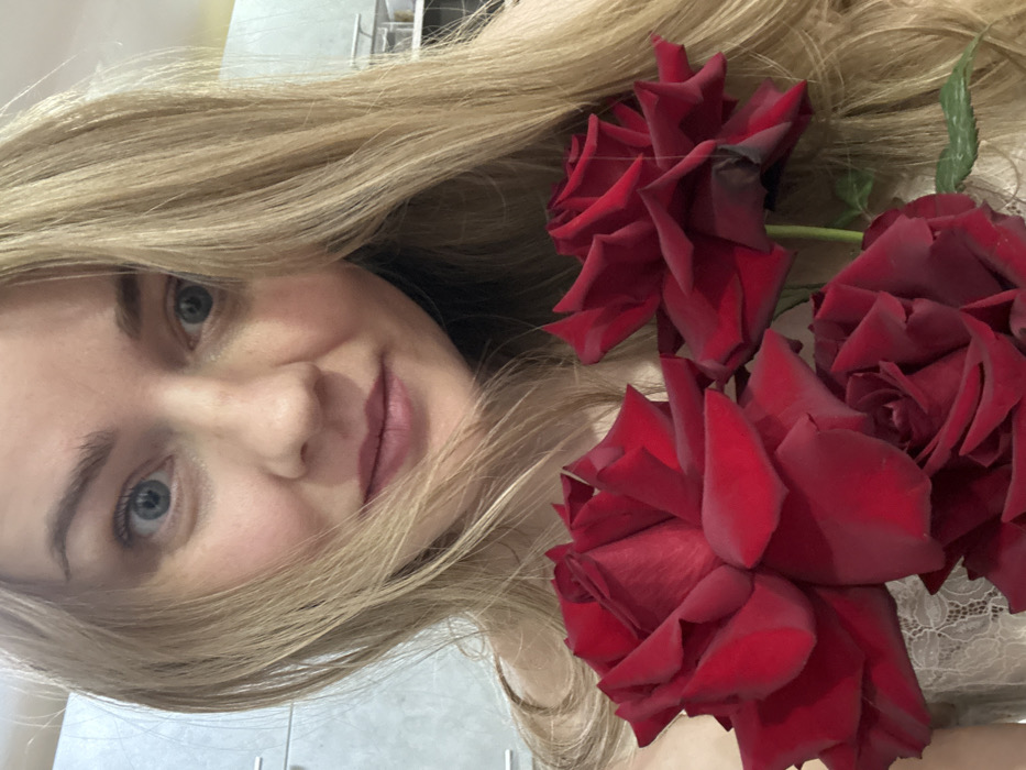 A blonde female subject is depicted in a close-up portrait, looking directly into the camera. Her light blonde hair is parted on the left and frames her face, extending over her shoulders. She has light blue-grey eyes and a slight smile. Her attire appears to be a light-colored top, with a lace pattern visible on her upper left chest. Three dark red, fully bloomed roses are positioned in the lower left quadrant of the frame, obscuring a portion of her chest and the lower section of her face. Green stems and some leaves are visible amongst the roses. The background is out of focus, suggesting an indoor setting. On the left side, light-colored cabinets with horizontal handles are visible. The specific location within the city of Chaikovsky, Russia, cannot be determined from the visual evidence presented.