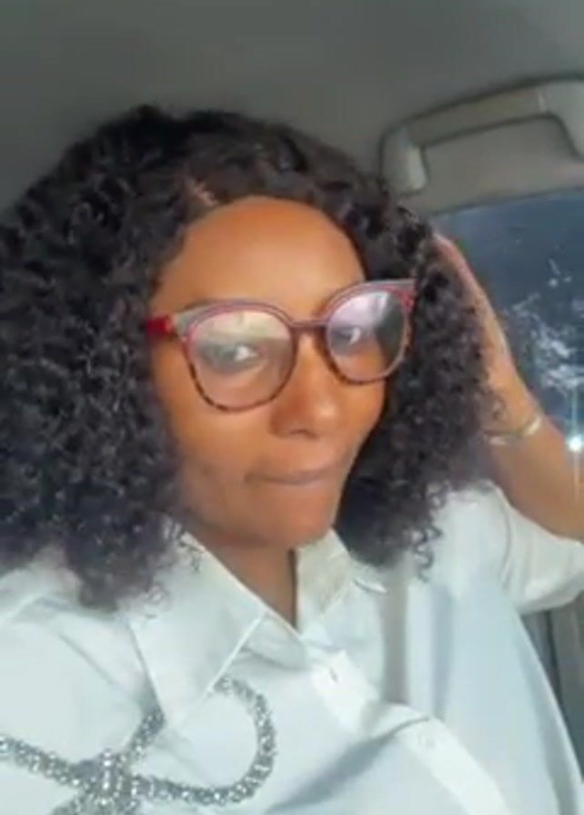 A woman with dark skin and curly hair is sitting in a car, facing the camera. She is wearing eyeglasses with red and brown rims and a white, collared shirt with a sparkling embellishment on the left side. The woman is seen adjusting her hair and looks at the camera during the recording. The background is partially visible through the car window, showing foliage, and the car's interior.