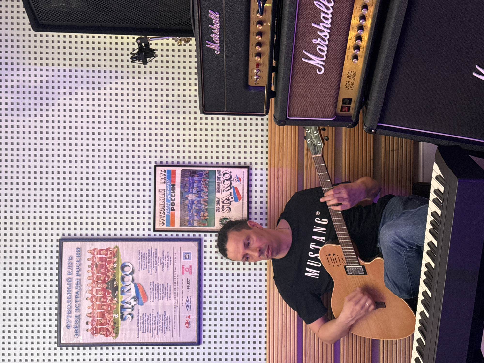 man in a black t-shirt with the word "MUSTANG" printed on it, sitting and playing an electric guitar in a room with musical equipment. He is fair-skinned and has dark hair pulled back. To his right is a keyboard. Behind him are Marshall amplifiers stacked on top of each other. On the wall are two framed posters in Russian, one reads "ФУТБОЛЬНЫЙ КЛУБ ЗВЁЗД ЭСТРАДЫ РОССИИ," meaning "Football Club of Pop Stars of Russia." The wall behind the posters has a grid-like pattern. The room appears to be a recording or practice studio, with acoustic treatment visible. There is no clear indication of the city of Moscow, Russia.