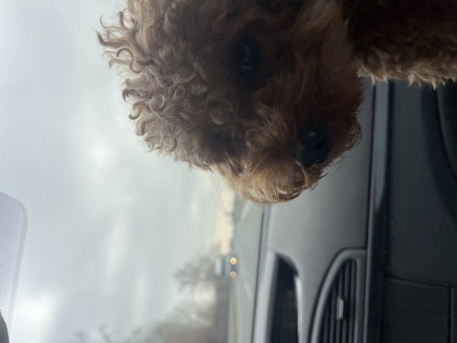 A small, brown, curly-haired dog is situated in the front passenger compartment of a vehicle, partially visible in the right foreground