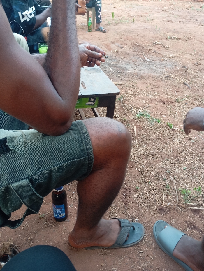 A group gathers outside, evident by the dirt ground. A man in shorts sits with an elbow on a small table, a cigarette held in his hand. A beer bottle sits on the ground next to his leg. Another man wearing flip flops stands in the background, and the feet of other individuals are partially visible. The scene implies a casual gathering with drinks and relaxation.