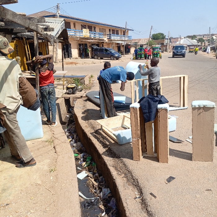 This image captures an outdoor furniture making or repair operation situated along a street in Jos, Nigeria, under a clear blue sky