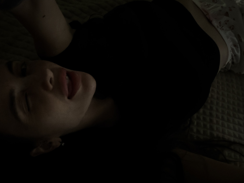A woman lies on a textured surface, possibly a bed or couch, wearing a black top and patterned shorts. Her face is visible, with one eye closed and lips slightly parted. The lighting is dim, with a stark contrast between the dark clothing and lighter skin. Part of her arm is visible raised up. Her head is resting on the surface, with dark hair blending into the background.