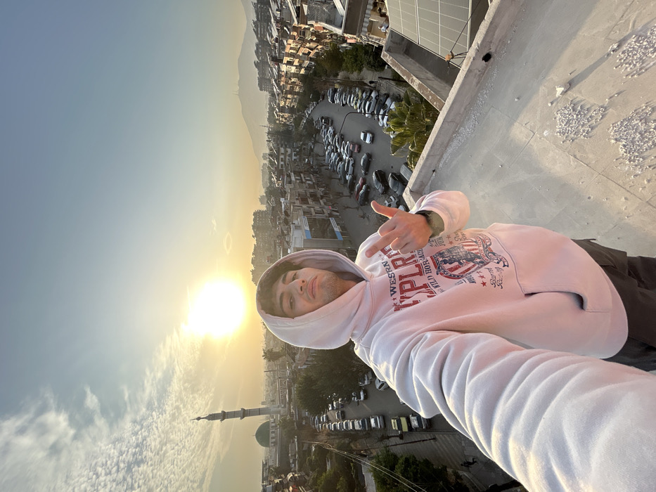 A male individual is depicted in a selfie, positioned on a concrete rooftop