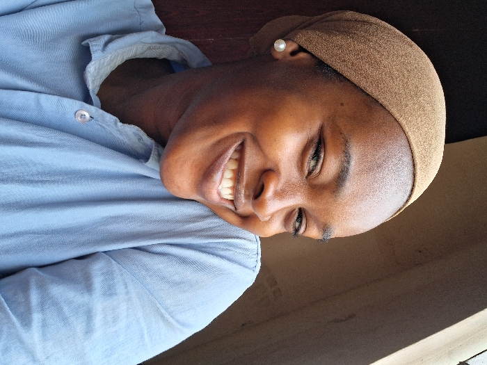 A headshot features a young adult female with dark skin, angled slightly towards the viewer and positioned off-center. She wears a light brown head covering, a light blue collared shirt with the top button unfastened, and a white pearl earring in her visible left ear. Her head is tilted to her right, and she displays a broad smile, revealing her teeth. The blurred background shows a dark, vertical, reddish-brown surface on the left, likely a door or frame, and a lighter, textured wall or structure on the right, illuminated by natural light. The specific location within Lagos, Nigeria, is not discernible from the visual information provided.