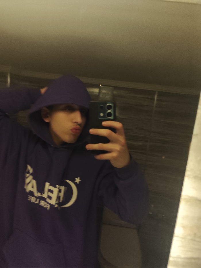 A person takes a selfie in a mirror wearing a purple hoodie. The hood is up, and they are making a puckered lips face. The hoodie has "FELAY FOR LIFE" printed in white letters, along with a crescent moon and a star. The person is holding a phone with a dual-camera system. The background appears to be a bathroom, with marble-like tiles visible in the mirror's reflection.