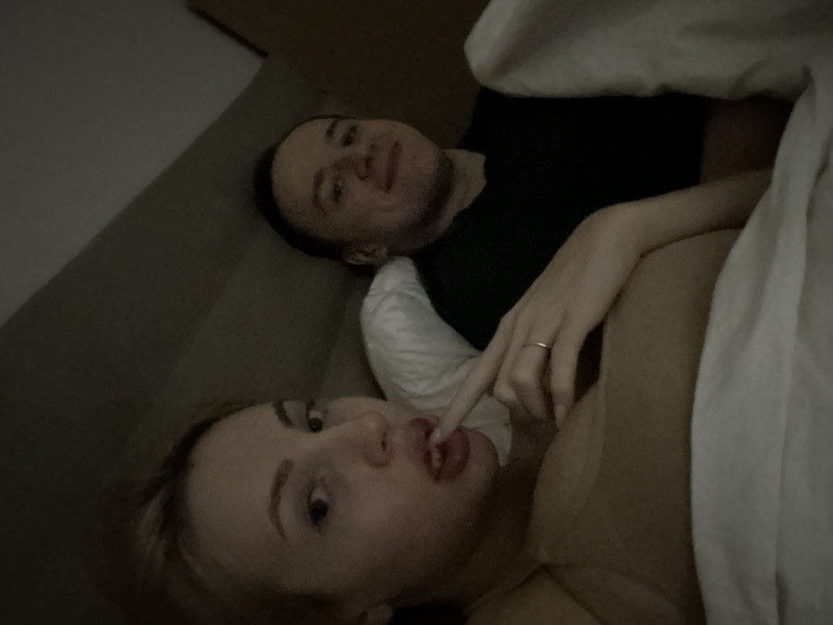 A selfie-style shot shows a couple in bed. The man lies in the background, wearing a dark shirt, while the woman is closer to the camera. She has her finger on her lips and is wearing a light-colored top. A white pillow is behind the man's head. A white sheet or blanket covers part of their bodies. The overall lighting is dim.
