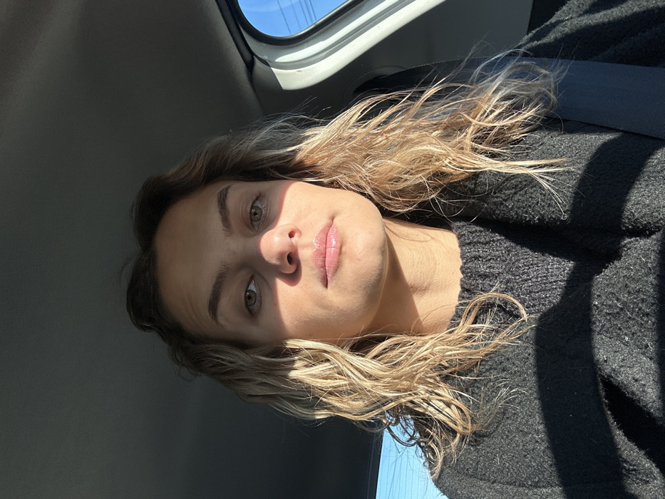 The image depicts a female individual seated within a vehicle. Her head and upper torso are visible, with her gaze directed towards the camera. She possesses wavy, shoulder-length blonde hair. Her eyes are light-colored, and her lips appear slightly parted with a glossy finish. She wears a dark gray knitted sweater beneath a darker, textured outer garment. A black vehicle seatbelt diagonally crosses her right shoulder and chest. Strong natural sunlight illuminates the right side of her face and hair, casting prominent shadows on the left side of her face and the left shoulder of her sweater. The vehicle's interior headliner is visible above her, and a section of a car window on the right reveals a clear blue sky with faint lines, possibly power lines or distant structures. No specific identifiers for a location within Veauche, France, are visible in the image. The individual appears to be posing for a photograph.