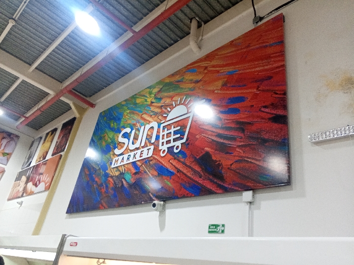 A large, colorful “Sun Market” sign dominates the image. The sign features a shopping cart with a sun rising above it. The background is a mix of red, orange, blue, and green brushstrokes. The sign is mounted on a white wall. A small green exit sign is visible below the large sign. A row of LED lights is to the right, and the ceiling features exposed metal rafters and a red pipe.