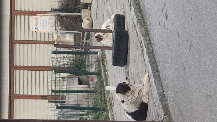 The image depicts a daytime urban scene on a street in Sliven, Bulgaria, adjacent to a commercial establishment. In the foreground, a gray asphalt road is visible, separated by a concrete curb from a light gray paved sidewalk. On the sidewalk, two dogs are resting. The dog on the left is large, with a shaggy coat, predominantly white with significant black patches over its back and head. It lies on its chest, facing right, away from the camera. The dog on the right is smaller, mostly white with light brown markings on its head and body. It is also lying down, positioned behind two black tires that are stacked horizontally on the sidewalk. This dog faces left, looking towards the larger dog. A brown metal pole passes vertically through the stacked tires. Another similar, solitary brown metal pole stands further left on the sidewalk. The background features a green wire mesh fence running horizontally, separating the sidewalk area from an unkempt space. Within this fenced area, sparse vegetation, piles of dry brush, and several light-colored concrete blocks are visible. A small red ball lies on the ground behind the fence on the left. Behind the fence and debris, a light-colored building with three prominent brown-framed windows, each fitted with light-colored horizontal blinds, is present. Attached to this building, partially obscured by a vertical pole, is a white rectangular sign with red and black Cyrillic text. The legible text on the sign reads "БУМЕРАНГ" (Boomerang), followed by "дрехи" (clothes), "играчки" (toys), "храни" (food), and "по шевст" (for tailoring/by sewing), indicating a "Boomerang" second-hand shop. The scene portrays a typical street environment in Sliven, Bulgaria, characterized by infrastructure, a commercial presence, and the presence of stray animals. No human figures are visible.