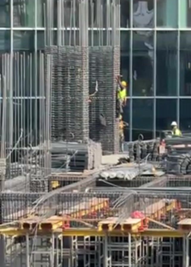 construction site with multiple workers present, primarily focusing on one worker wearing a yellow hard hat and a safety vest who is climbing a structure made of rebar