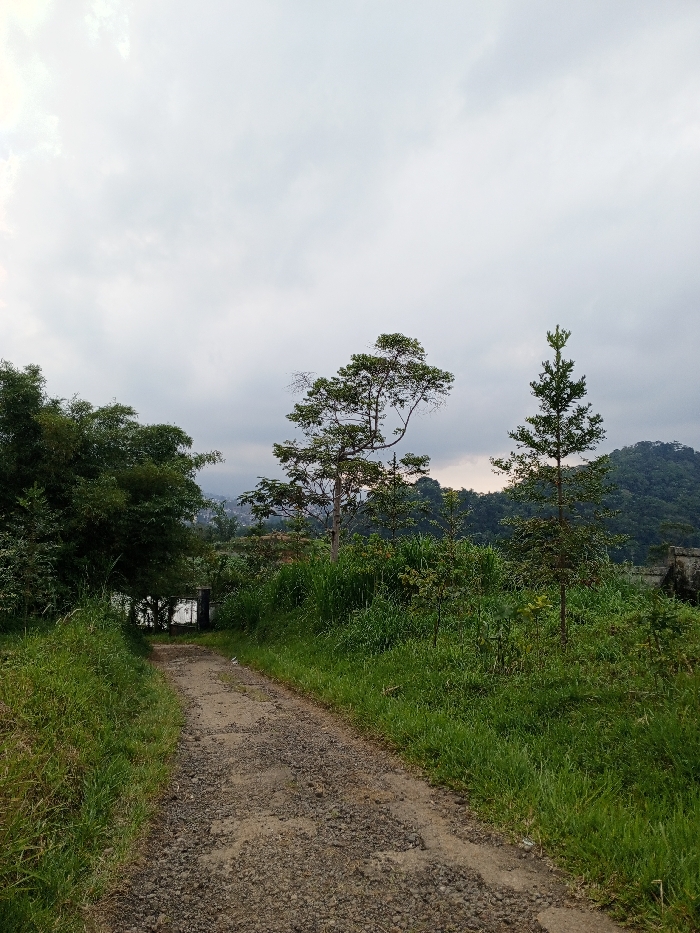 This image displays an outdoor, rural landscape in Thotagamuwa, Sri Lanka. A central unpaved path, composed of gravel and dirt, recedes from the foreground towards the middle distance. The path is flanked by dense green grass and various shrubs. No human figures or discernible actions are present. On the left, a thick stand of bamboo and other foliage partially obscures a light-colored gate or structure further along the path. On the right, tall green grass and scattered shrubs cover the terrain. Two distinct trees are visible in the midground: a broad-canopied tree on the left and a slender, conical tree on the right. Distant forested hills dominate the right background, while elements of a distant town are faintly discernible on the left horizon. The sky is uniformly overcast with grey clouds.