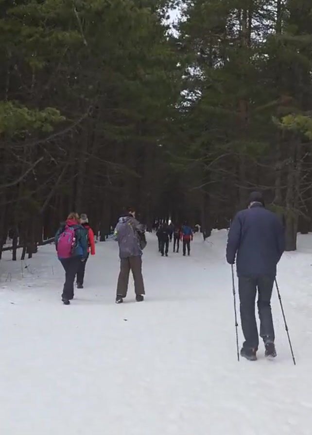 A group of people are walking away from the viewer, along a path covered in snow, through a dense forest of tall evergreens. The people are dressed in winter clothing, with several wearing backpacks. One person in the foreground uses walking sticks. The sky is overcast, and the light is diffused. The ground is entirely covered in white snow. The path appears to be slightly uphill.