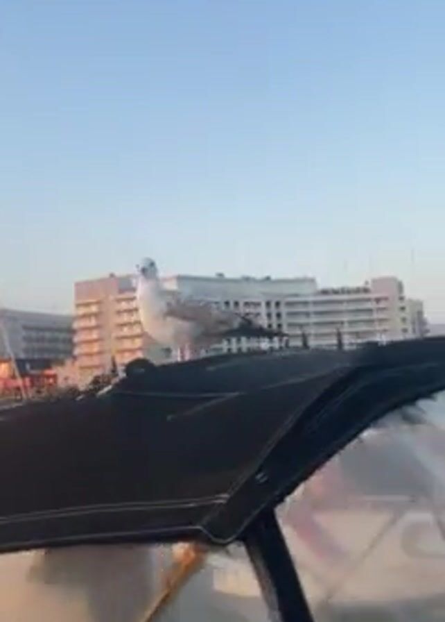 A seagull sits atop a boat cover in a marina before taking flight. The bird is white and gray, with a black beak. It is perched on the black, tarpaulin-covered boat, with other boats visible in the background. A person can be heard saying "Hello, what are you doing?". The camera then pans back to show the marina, with sailboats and multistory buildings on the shoreline. The water is calm and the sky is clear, a pale blue.