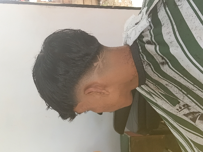 A male individual is depicted in right profile, seated and receiving a haircut in Mns Alue, Indonesia