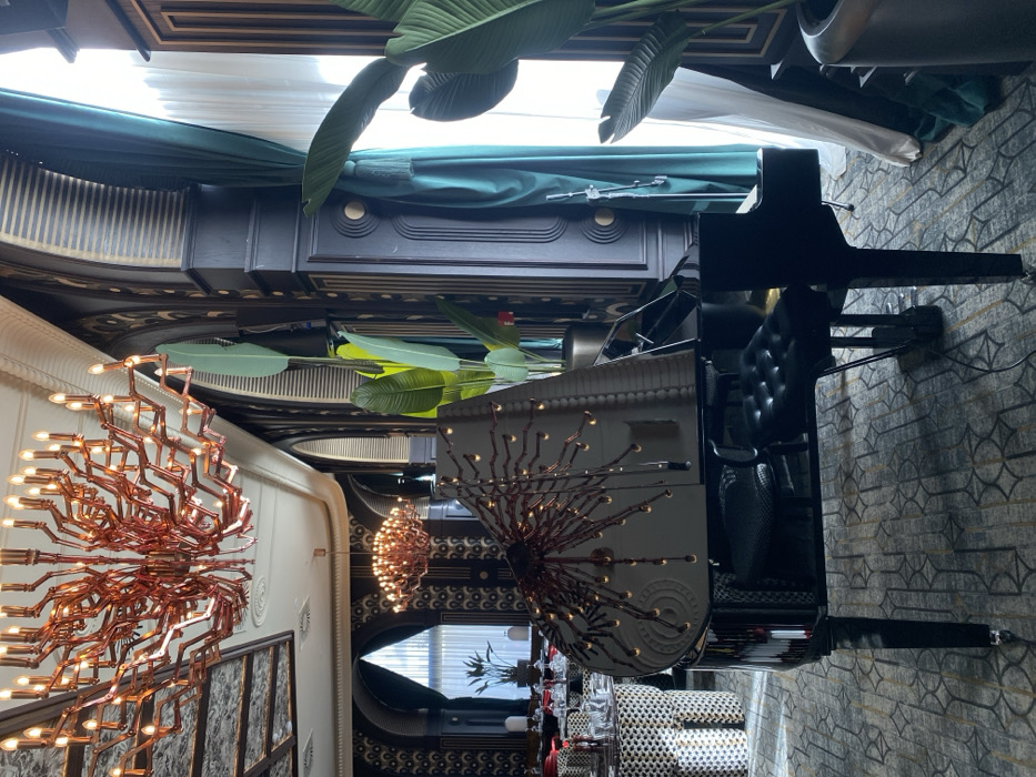 The image depicts the interior of a luxurious establishment, identified as the Saint Ten Hotel in Belgrade, Serbia. The scene is centered around a polished black grand piano with a matching tufted black leather bench, positioned on a gray and beige geometrically patterned carpet. Overhead, a prominent, multi-branched chandelier with numerous illuminated bulbs, appearing coppery or rose-gold, hangs from a white ceiling. A similar, smaller chandelier is visible further back in the room. The background features dark wood paneled walls adorned with gold accents and geometric patterns, interspersed with arched architectural elements. Large, broad-leafed green potted plants are placed throughout the space, with one on the immediate right and another behind the piano. Tall windows draped with long teal curtains and sheer white inner curtains are visible on the right, providing natural light. In the distance, through the arches on the left, several dining tables set with white tablecloths, glassware, and chairs featuring a black and white patterned fabric are visible. No individuals are present in the frame. A microphone stand is partially discernible against the wall near the piano.