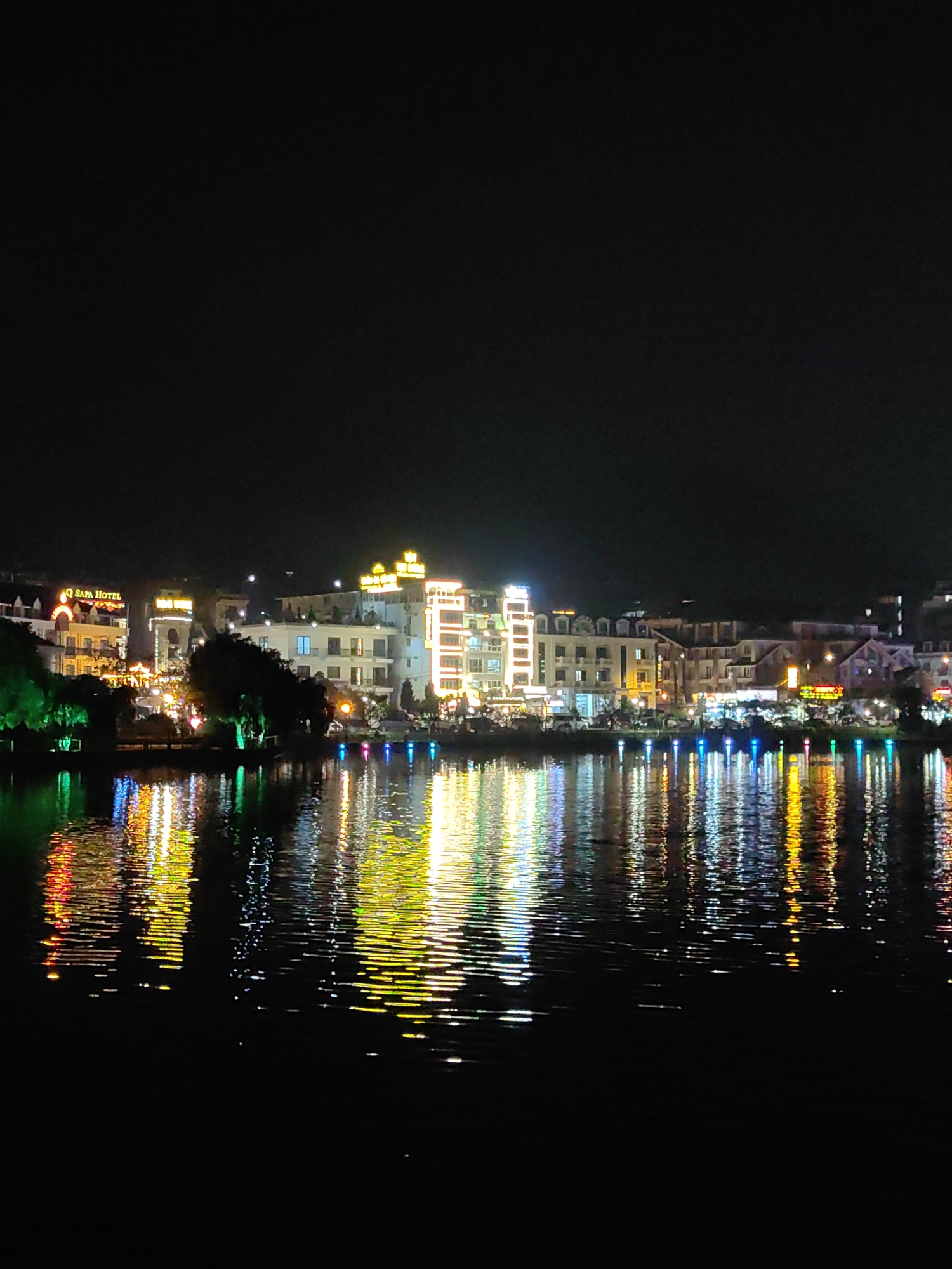 The image presents a nighttime wide view of the illuminated city shoreline of Sa Pa, Vietnam, seen across Sa Pa Lake. The upper third of the frame is an undifferentiated dark sky. Below, a continuous line of multi-story urban structures occupies the mid-ground along the lake's edge. These buildings feature numerous windows and are extensively lit by artificial sources, predominantly yellow, white, and orange light. Visible illuminated signage includes "O SAPA HOTEL" on the left and "PARK HOTEL" further left. Interspersed along the shoreline are trees and shrubs; some trees on the far left are illuminated with green light. At the immediate water's edge, a series of smaller, distinct multi-colored lights (blue, green, red, yellow) are visible. The lower two-thirds of the image comprises the dark, reflective surface of Sa Pa Lake, upon which the urban lights are cast as vibrant, elongated, and shimmering streaks, distorted by surface ripples. No human figures or discernible activities are present. The scene depicts an urban lakeside environment under artificial night illumination.