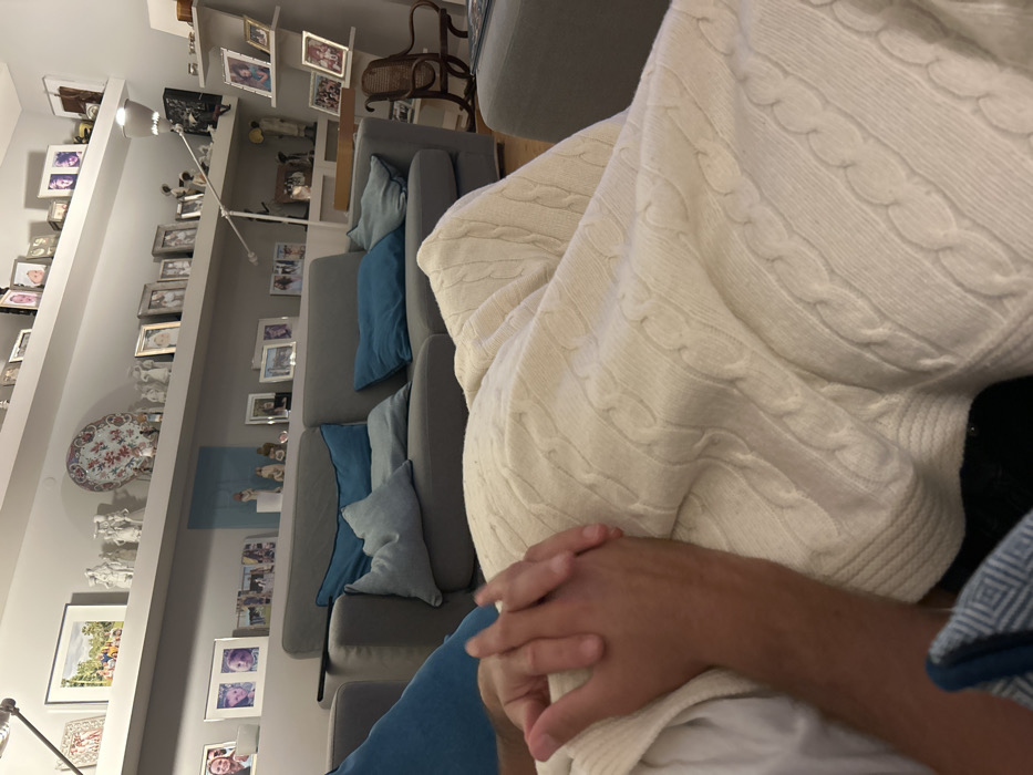 This image captures a residential living room in Lisbon, Portugal, from a first-person perspective. In the immediate foreground, two hands are clasped together; the left hand is darker-skinned with a light blue sleeve, while the right hand is lighter-skinned, emerging from under a cream-colored cable-knit blanket. This blanket covers the legs of one individual. A blue and white patterned textile is partially visible in the bottom left. In the midground, a gray multi-seat sofa with various blue throw pillows (plain and patterned) occupies the center. To the right of the sofa, a small, dark wooden rocking chair is present, and a light gray ottoman is visible in the bottom right. The background consists of a light gray wall adorned with multiple horizontal white floating shelves. These shelves are densely arranged with numerous framed photographs of people, assorted ceramic figurines, and decorative plates, notably one with a floral design. A modern white adjustable floor lamp stands on the right, extending over one of the shelves. The room is illuminated by ambient artificial lighting.
