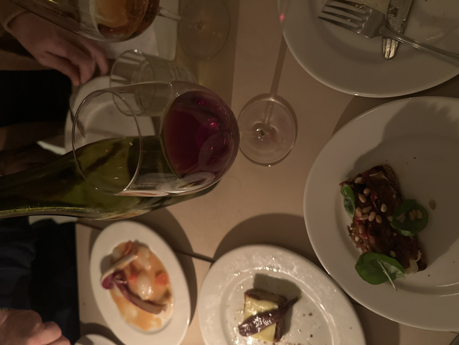 A table setting features small white plates with appetizers. One plate has a bruschetta topped with pine nuts and greens, another features a scallop dish, and the third presents a small cheese square with an anchovy. A partially filled glass of red wine sits beside an empty glass. Cutlery lies on another plate. A wine bottle is in the process of pouring into another glass.