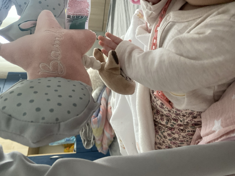 This image depicts an infant interacting with a baby mobile within an indoor domestic setting in the city of Blagoevgrad, Bulgaria. The upper torso and left arm of an infant are visible in the foreground, wearing a light beige or off-white long-sleeved onesie. The infant's left hand is reaching upwards, grasping or touching a small, light brown plush toy with dark brown hooves, which is suspended from a baby mobile. A pink pacifier, attached to a pink plastic chain, is clipped to the infant's clothing on the right side. The infant is lying on or covered by a white textured blanket, which rests over a floral-patterned fabric featuring pink, white, and brown flowers on a light background. Above the infant, the baby mobile displays several plush elements, including a grey polka-dotted crescent or cloud shape, and a pink star embroidered with the word 'Bambi' in white script. A white care tag with black symbols, including 'DO NOT IRON,' hangs from the mobile. In the blurred background, a stack of pastel-colored folded textiles (pink, blue, yellow, white) is visible on a surface, with a dark blue piece of furniture (possibly a cabinet or shelving unit) behind them.