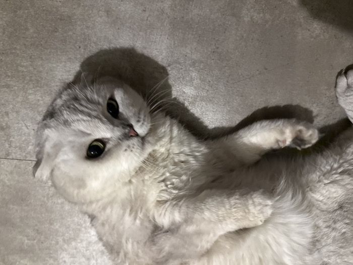 A silvery-grey cat lies on its back on a grey surface. The cat has distinctive folded ears, large round eyes, and a fluffy coat. Its head is turned slightly towards the camera, with one paw raised near its chest. The cat's shadow is visible on the surface, adding depth to the image.