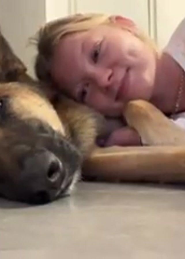 A woman and a dog are lying on a floor. The floor appears to be stone. The woman is wearing a white shirt. The dog is light brown and black, possibly a German Shepherd. The dog is lying next to a wall. The woman kisses the dog on the head, and then rests her head on the dog’s head.