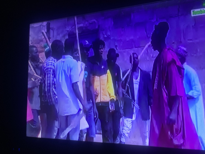 A group of people stand in a close gathering, some holding sticks. A man in a red robe stands to the right, while another wears a yellow and black jacket in the center. Most men are dressed in shirts and trousers. The scene has a slightly dim and purplish lighting. A building is partially visible in the background. The image seems to be a screen capture, possibly from a television show.