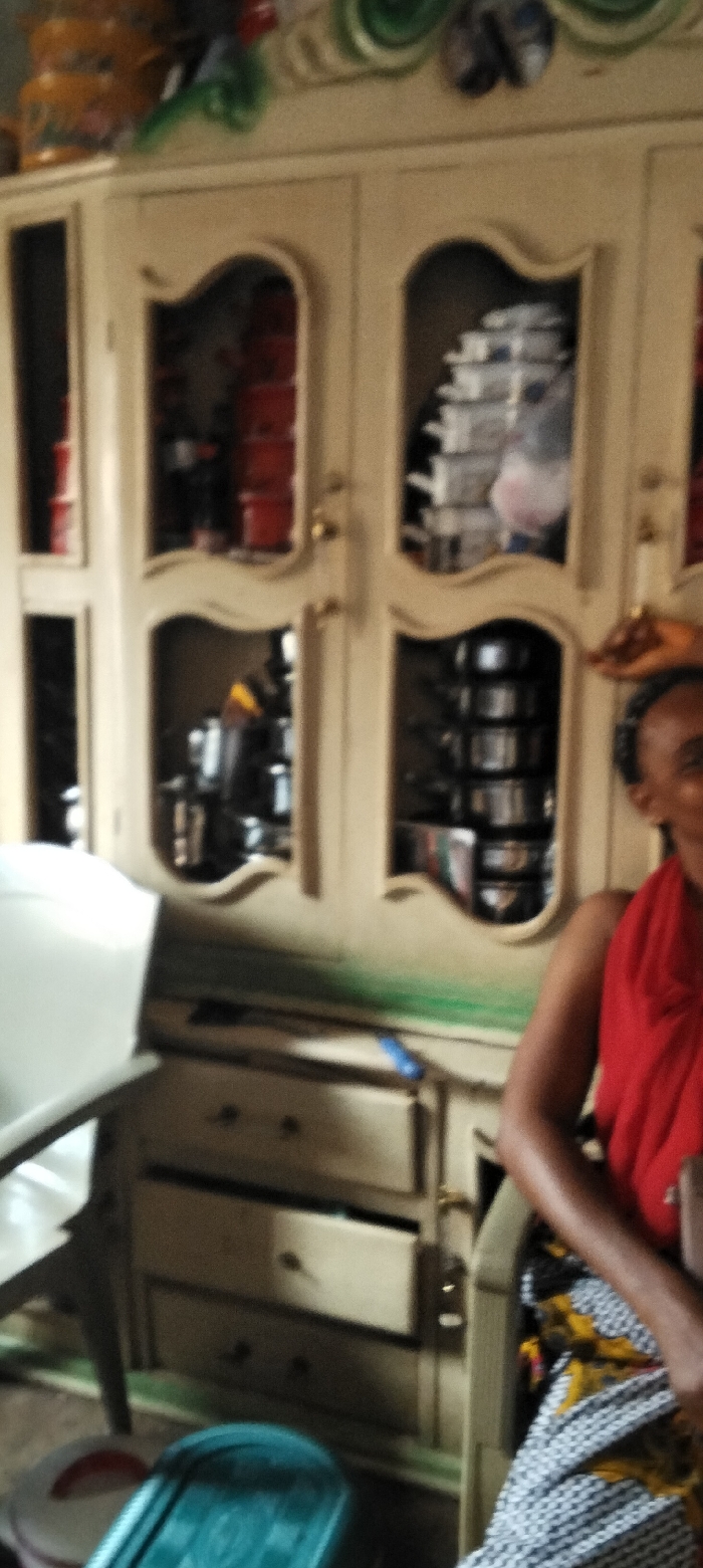 An indoor scene depicts a kitchen or dining area primarily occupied by a light-colored wooden hutch or cabinet. The cabinet features multiple glass-fronted sections with arched tops, displaying stacks of red containers, white or silver plates, and metallic pots. Below the glass sections are drawers with dark knobs. A horizontal green strip is visible across the cabinet's lower half, with a blue object resting on it. To the left, a white table with a metallic leg is partially visible. On the right, an adult female is seated, partially visible from the chest down. She has dark skin, wears a red top, and a patterned skirt with black, white, and yellow. Her right arm is visible, resting in her lap. Her head is turned slightly to the left, and she appears to be smiling. The floor at the bottom left shows a blue object, possibly a container. The location is the city of Unknown, Unknown.