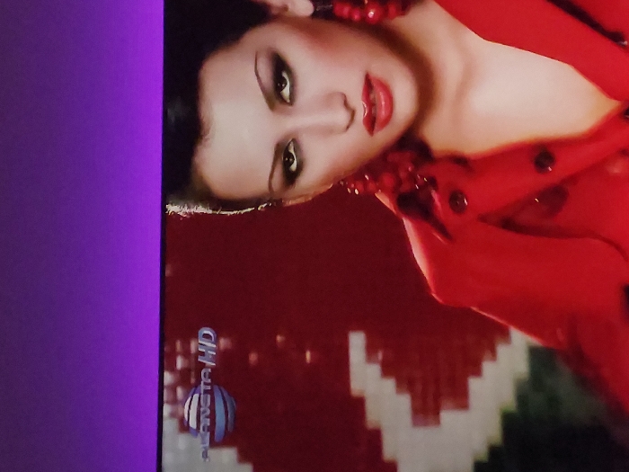 The image is a photograph of a television screen displaying a broadcast. The upper portion of the photograph above the screen is a solid purple color. On the television screen, in the upper left, the logo "PLANETA HD" is visible, featuring a stylized globe with blue and white stripes and text. The central subject on the screen is a young adult female, depicted from the chest up, looking directly towards the viewer. She has dark hair styled away from her face, heavy dark eye makeup, and glossy red lips. She wears a red garment, which appears to be a jacket or coat, with several dark buttons visible on the front. Large, red, spherical earrings are worn on both ears. The background of the broadcast consists of a solid red wall behind the woman's right side, and a prominent white pixelated zig-zag pattern against a red field behind her left shoulder.