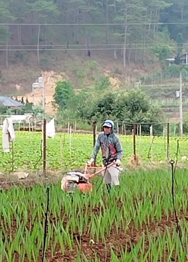 A farmer is operating a rototiller in a field of long, thin green plants. The farmer is wearing a light blue cap, glasses, a patterned long-sleeved shirt, and dark-colored shorts. The rototiller is orange. The field is surrounded by a simple fence made of posts and wire. In the background, there's a hillside with trees, and a few houses are visible. Clothes hang on a line near the edge of the field. The weather appears overcast.