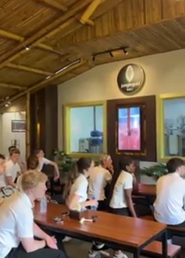 A group of young people is seated at tables in a room that has an exposed bamboo ceiling and a logo for a business called Junglegold Bali on the wall