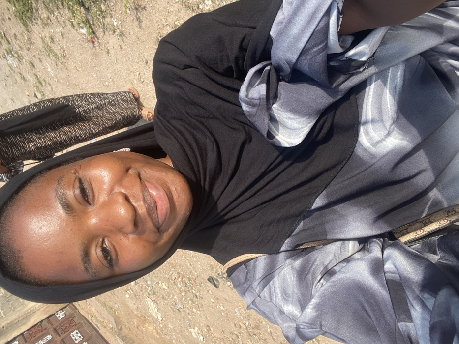 The image displays a close-up, selfie-style photograph of a young woman with dark skin, smiling and looking directly at the camera. She wears a black head covering (hijab) and a dress featuring a solid black upper portion and a lower section with a grey and white abstract, swirling pattern. A small, light-colored earring is visible on her left ear. A light-colored strap, consistent with a purse or bag, is partially visible near her right arm. In the background, a second individual is partially visible from the waist down, positioned behind and to the right of the main subject. This individual wears a dark, possibly patterned, long garment and light-brown sandals. The ground is unpaved, appearing as packed dirt or gravel with sparse debris. A light-colored building wall with a dark, possibly metallic, gate or door is partially visible in the distant left background. The scene is outdoors and brightly illuminated by direct sunlight. The specific location within Zango-ndaji, Nigeria, is not ascertainable from the visual evidence.