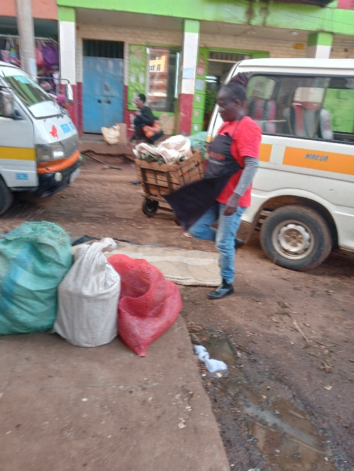 A woman in a red shirt, jeans, and a black apron stands on a dirt road beside a white van labeled "MARUA." Behind her is a wooden cart filled with bags. In the foreground are three large bags colored green, white, and red. The road is muddy with a small stream of water and scattered trash. In the background, a person sits near a blue door of a building painted green and white. A second van is parked to the left.